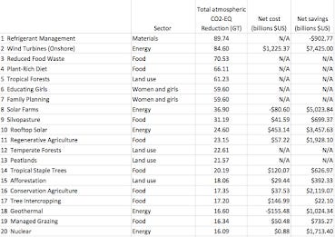 Most of this Top 20 list focuses on Food (8 solutions) and Land use (4 solutions). There are a lot of opportunities for action here that are barely being discussed.